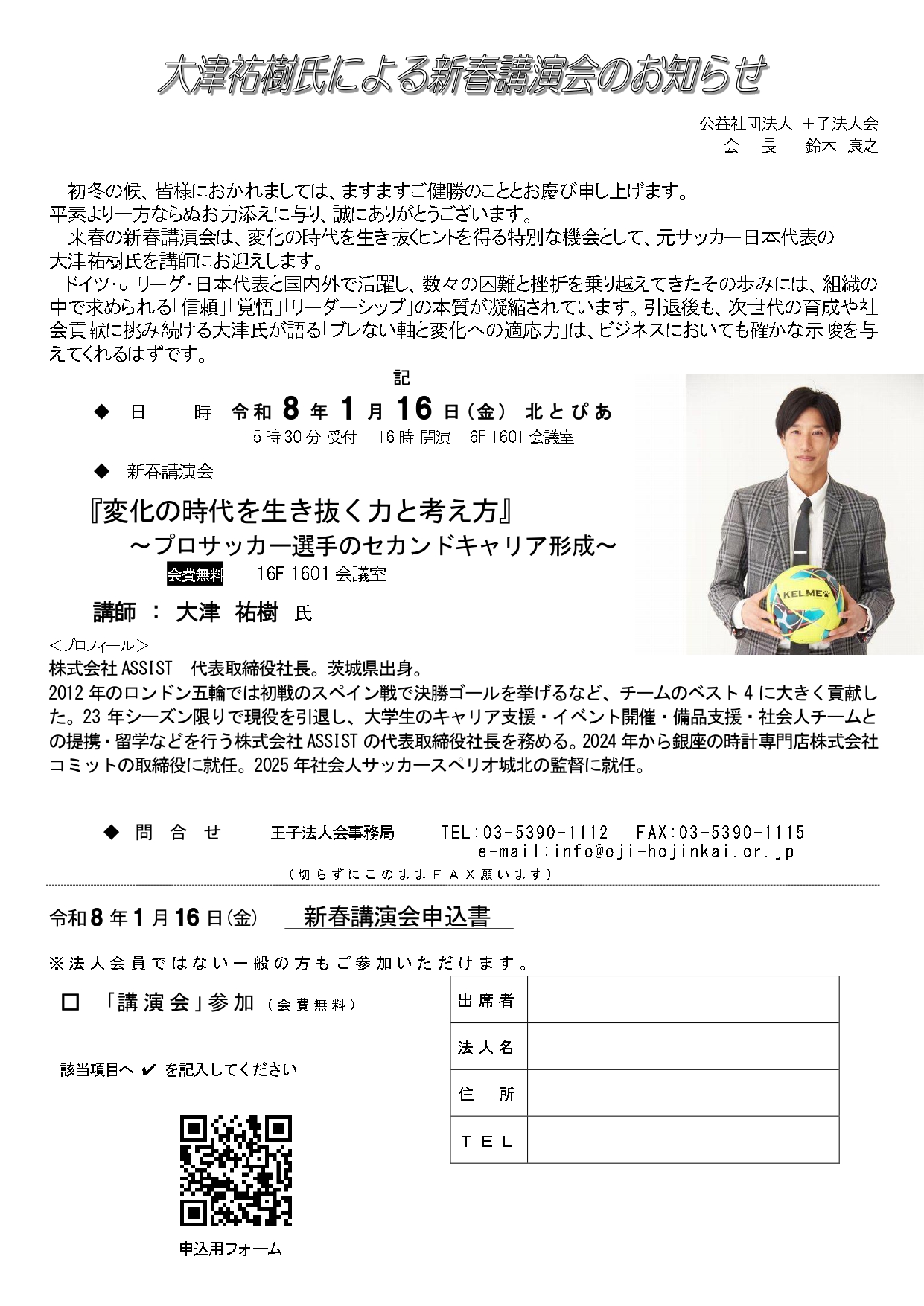 来春の新春講演会は、変化の時代を生き抜くヒントを得る特別な機会として、元サッカー日本代表の大津祐樹氏を講師にお迎えします。ドイツ・Jリーグ・日本代表と国内外で活躍し、数々の困難と挫折を乗り越えてきたその歩みには、組織の中で求められる「信頼」「覚悟」「リーダーシップ」の本質が凝縮されています。引退後も、次世代の育成や社会貢献に挑み続ける大津氏が語る「ブレない軸と変化への適応力」は、ビジネスにおいても確かな示唆を与えてくれるはずです。新春講演会の入場料は無料です。ご参加をお待ちしております。