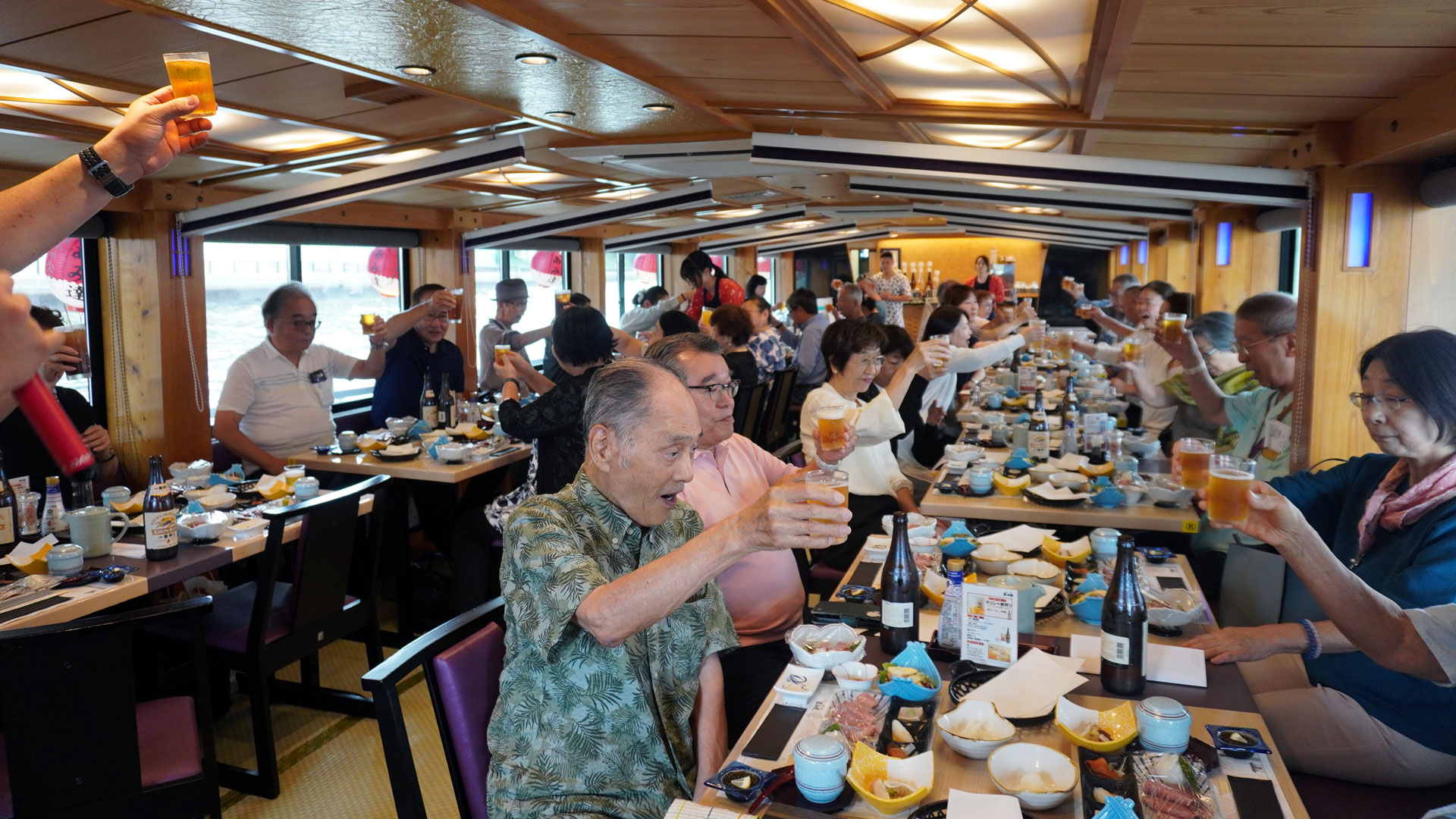 屋形船交流会には、総勢39名が参加し、無事に出航しました。あいにくの曇り空ではありましたが、荒天になることもなく一安心。厚生委員長のあいさつに続き、屋形船係委員からの注意事項説明が行われた後、乾杯となりました。皆さまは会食と交流を楽しみながら歓談を深め、やがて撮影スポットへ到着。参加者全員で記念撮影を行いました。